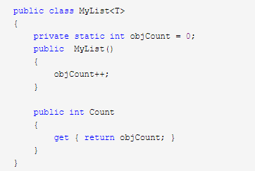 該例中,我創建了一個稱為MyList泛型類。為把它參數化,我簡單地插入了一個尖括號。在<>內的T代表了實際的當使用該類時要指定的類型。在MyList類中,定義了一個靜態字段objCount。我在構造器中增加它的值。因此我能發現使用我的類的用戶共創建了多少個那種類型的對象。屬性Count返回與被調用的實例同類型的實例的數目。