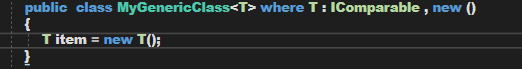 你可以指定約束的組合,就象: where T : IComparable, new()。這就是說,用于參數化類型的類型必須實現Icomparable接口并且必須有一個無參構造器。