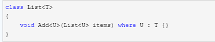 用作約束的泛型類型參數稱為裸類型約束。當具有自己的類型參數的成員函數需要將該參數約束為包含類型的類型參數時,裸類型約束很有用。